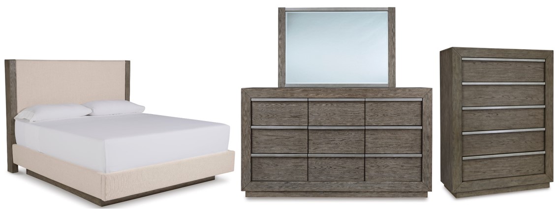 Includes queen upholstered panel (headboard, footboard and rails), dresser, mirror, and 5-drawer chest