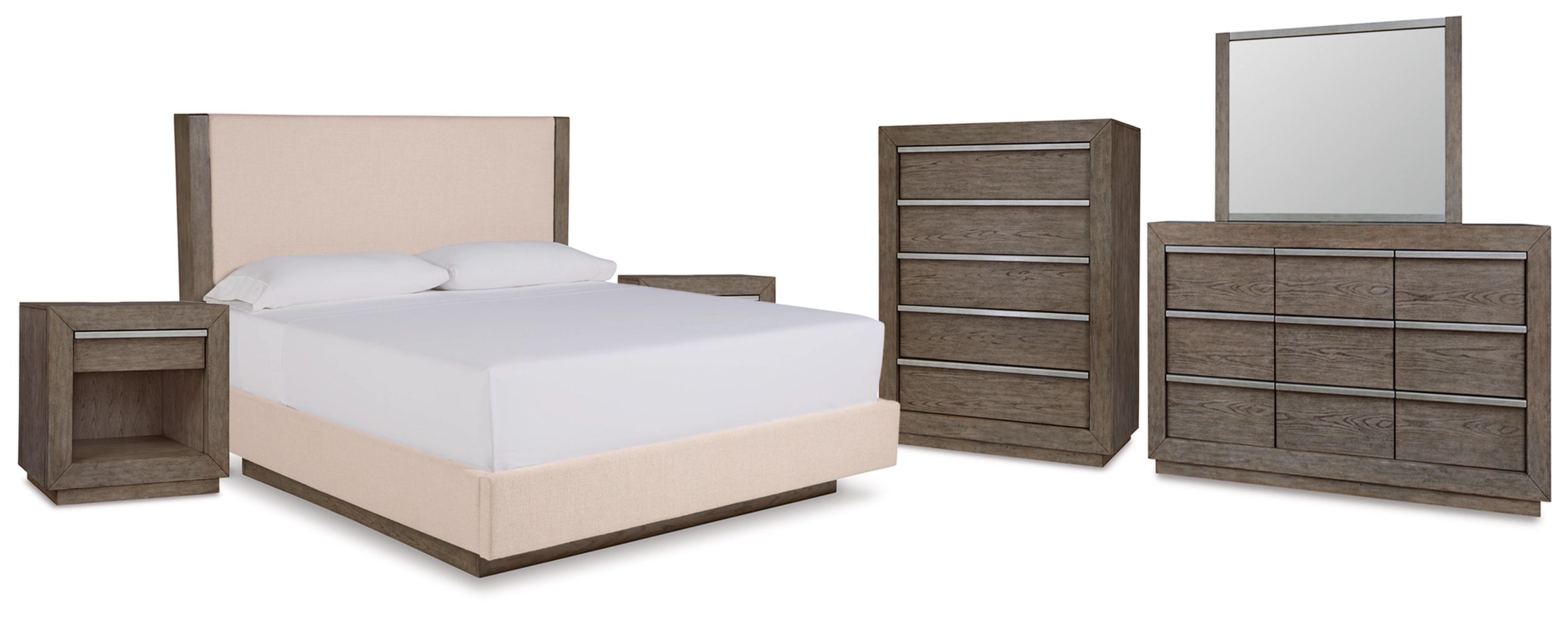 Includes queen upholstered panel headboard and footboard with rails, dresser, mirror, chest, and two nightstands