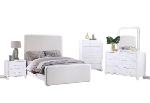 Simplicity of color and silhouette highlight a five-piece modern bedroom set that includes an upholstered bed, nightstand, chest, and dresser and mirror combination. Fresh and light, the set brings airy elegance, featuring a pearl white finish and light beige, textured upholstery over foam padded for exceptional lounging.Read More