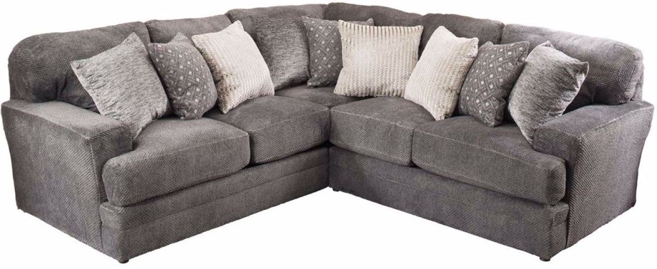 The Mammoth 2 Piece Sectional by Jackson Furniture cradles you as you sink into its oversized cushions and soft, textured polyester fabric. The neutral smoky gray color is sure to complement a variety of designs, as is the selection of nine accent pillows that add pattern and texture to the look.